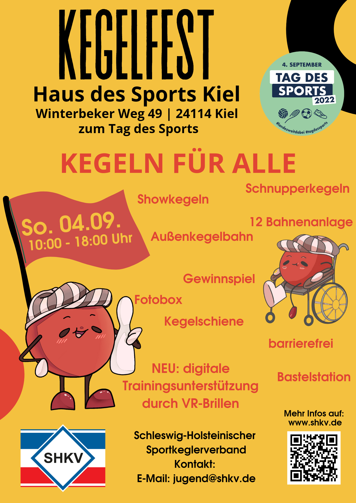 Auf den zwölf Bahnen im Kieler Haus des Sports sowie einer Freiluft-Kegelbahn wird den ganzen Tag über eifrig für die "umwerfende" Sportart geworben. Neben dem kostenfreien Spiel auf "alle Neune", Showkegeln und Schnupperkegeln, stehen ein attraktives Gewinnspiel, eine Fotobox und eine Bastelstation, bei der u.a. "echte" Kegel fantasievoll bemalt werden können, auf dem Programm der barrierefreien Veranstaltung.