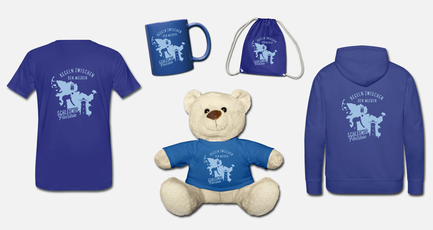 Neben T-Shirts und Pullovern können dort auch Taschen, Becher, Tassen und viele Souvenirs bestellt werden. Allen Produkten gemeinsam ist das Erscheinungsbild mit dem neuen Aufdruck "Kegeln zwischen den Meeren". Alle Produkte lassen sic...