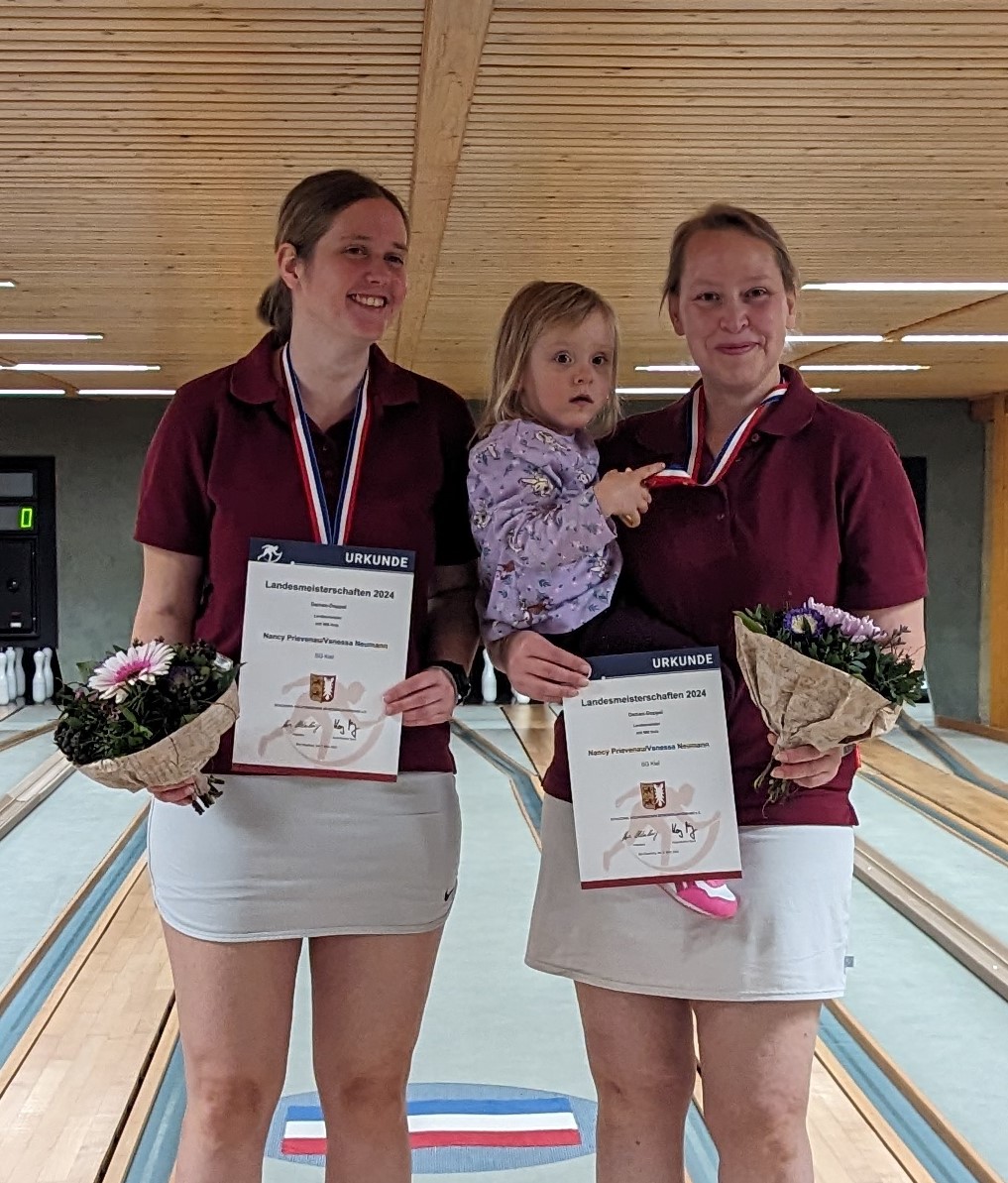 Zuvor kämpften zehn Damen-Doppel um den Titel, den sich die Kielerinnen Vanessa Neumann/Nancy Prievenau sicherten. Ihre 886 Holz bedeuteten ebenfalls einen hauchdünnen Vorsprung von nur einem Holz vor Alexandra Hellberg/Christiane Künstler von der SG Holstein. Dritte, aber auch hier ohne DM-Startrecht, wurden die Oldenburgerinnen Nina Rexin/Nadine Neuhäuser mit 879 Holz. Die Vorjahressiegerinnen Meike Marchewka/Katrin Schulz (SG Bordesholm/Rendsburg) waren nicht am Start.