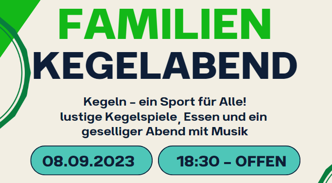 Kegel ist ein Sport für alle! - Beim Familienkegelabend wird dieses Motto gelebt. Ab ~18:30 können sich Interessierte in der Kegelhalle treffen und gemeinsam bei Essen, Getränken und lustigen Kegelspielen einen schönen Abend verbringen.