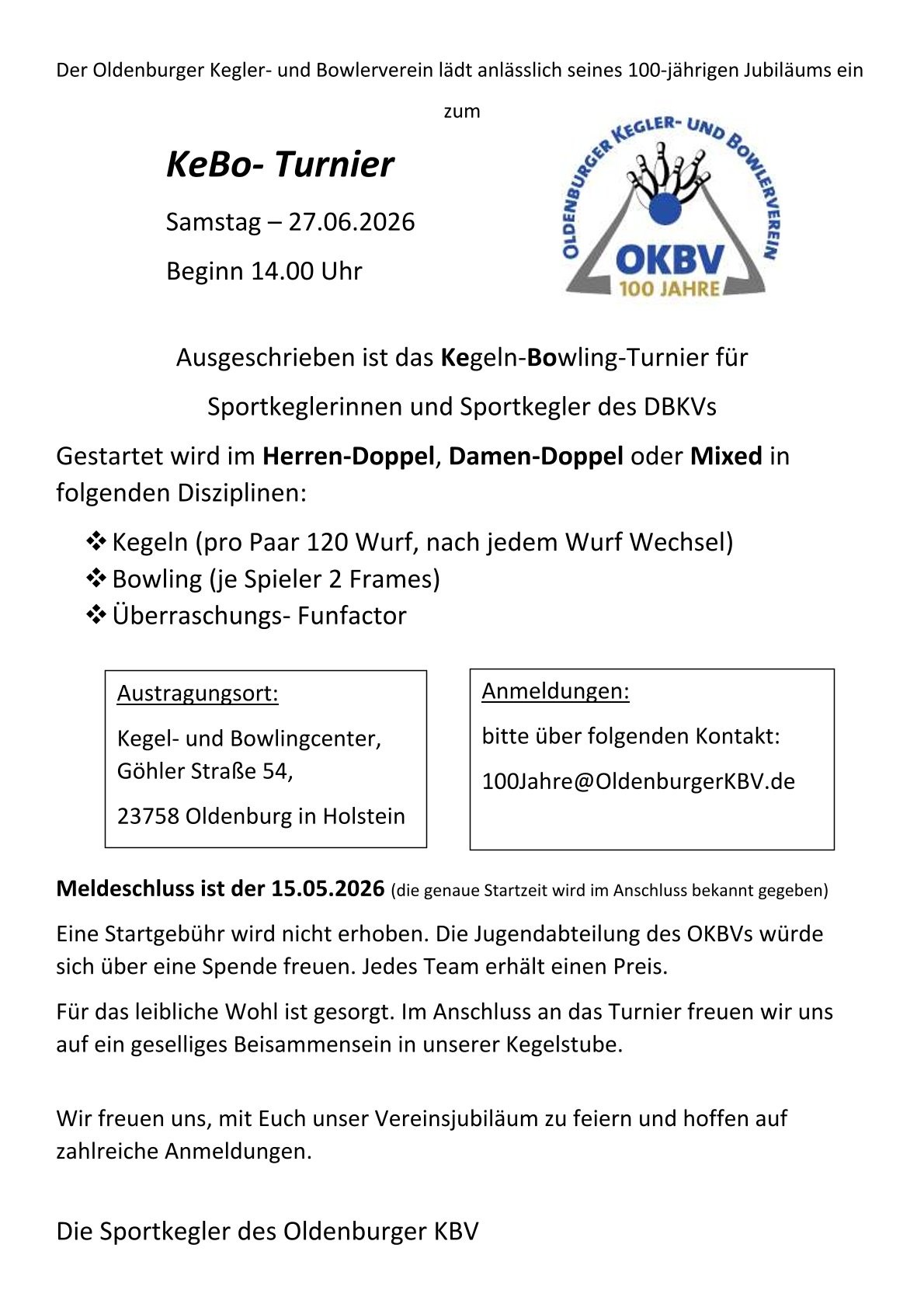 Der Oldenburger Kegler- und Bowlerverein lädt anlässlich seines 100-jährigen Bestehens zum Jubiläumsturnier ein. Gespielt wir ein Kegel- und Bowling-Turnier für Damen-Doppel, Herren-Doppel und Mixed, und zwar am Sbd. 27. Juni 2026